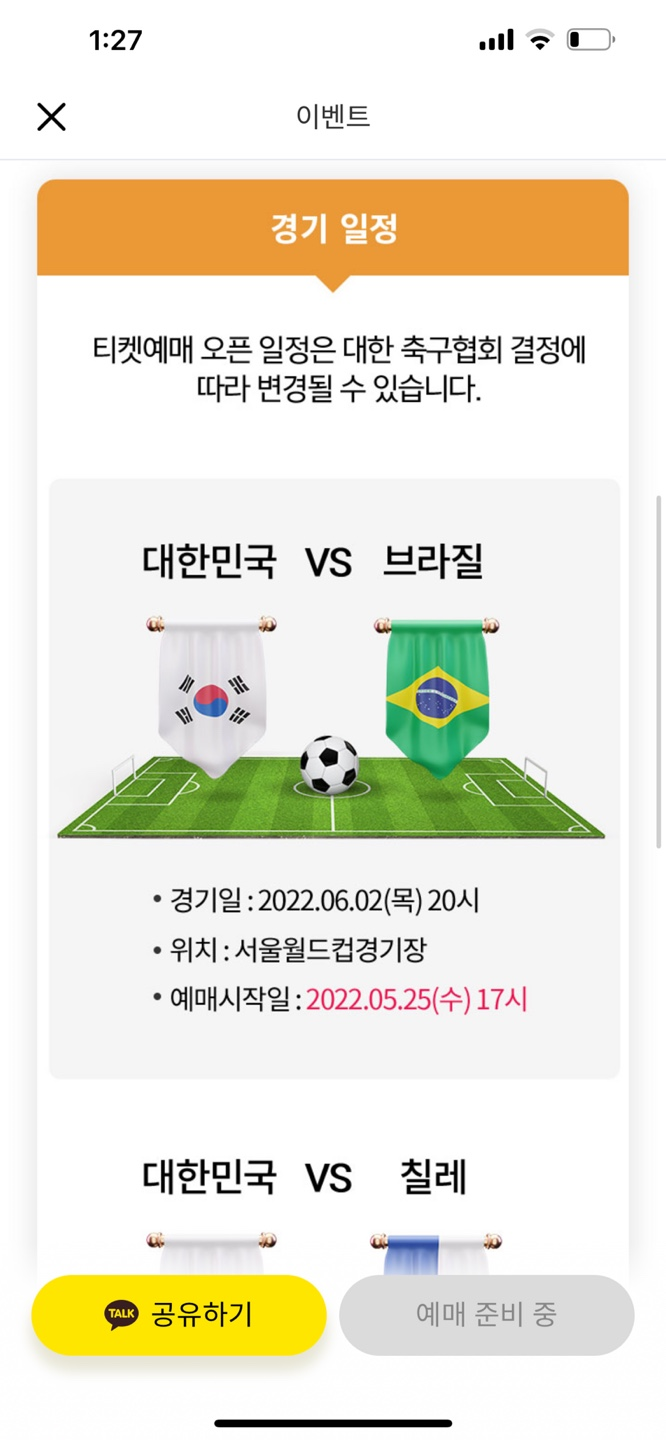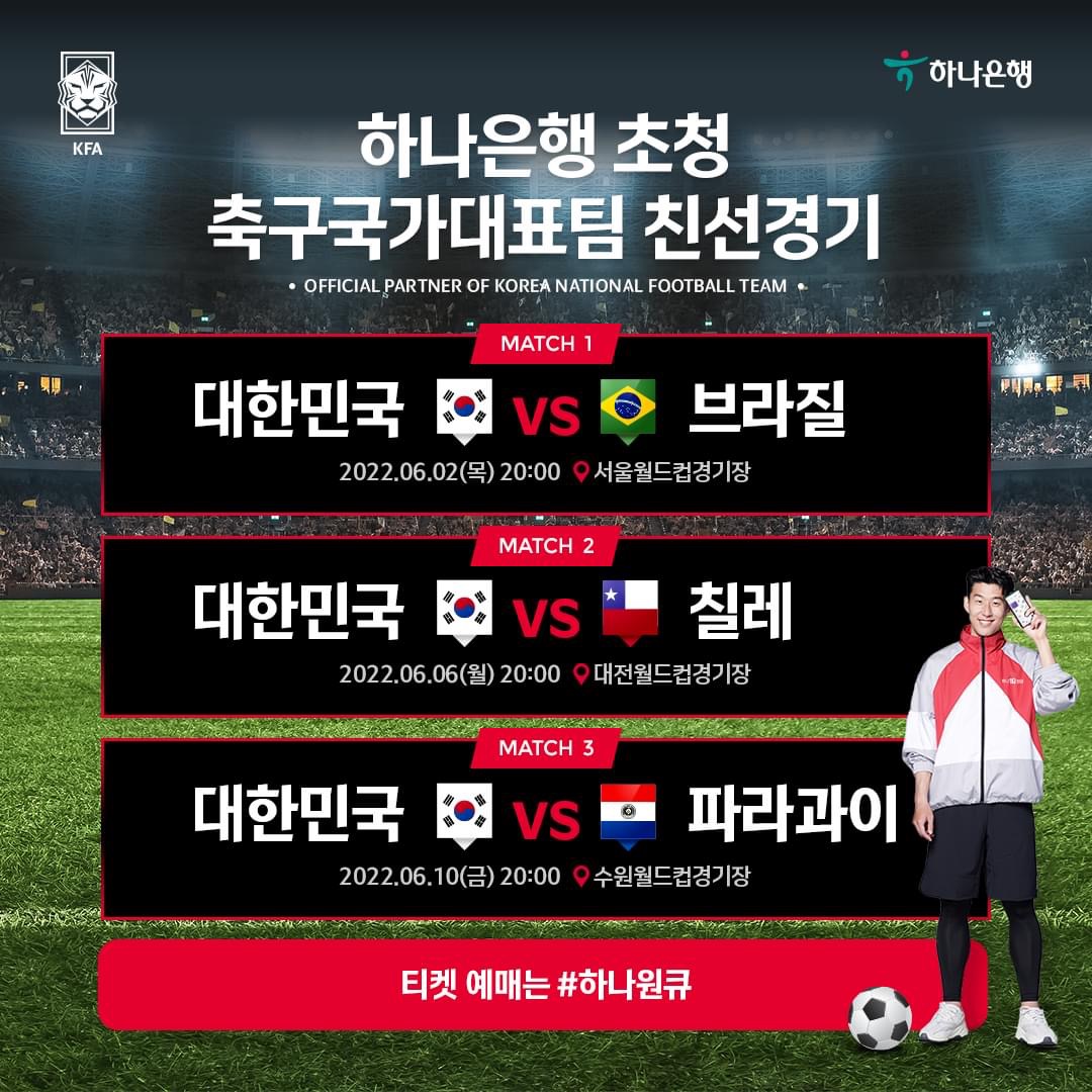 특히 이번 브라질전은 하나원큐에서5월 25일 수요일 17시에 예매가 오픈된다고 안내되어있어 다른 인터파크 등 다른 예매 가능한 플랫폼에서도 비슷한 일정으로 열릴 것으로 추정됩니다!