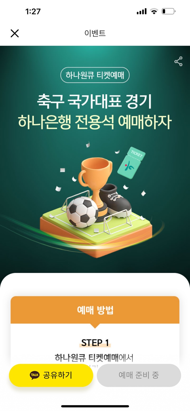 아래와 같이 하나은행 스마트폰 뱅킹인 하나 원큐 앱에서 국가대표 축구팀 A매치 경기를 예매할 수 있는 페이지가 오픈했습니다. 아직 예매 준비 중으로 나오지만, 하나 원큐에서 전체는 아니지만 부분적으로 A매치 경기 티켓을 예매할 수 있다는 추정이 됩니다.